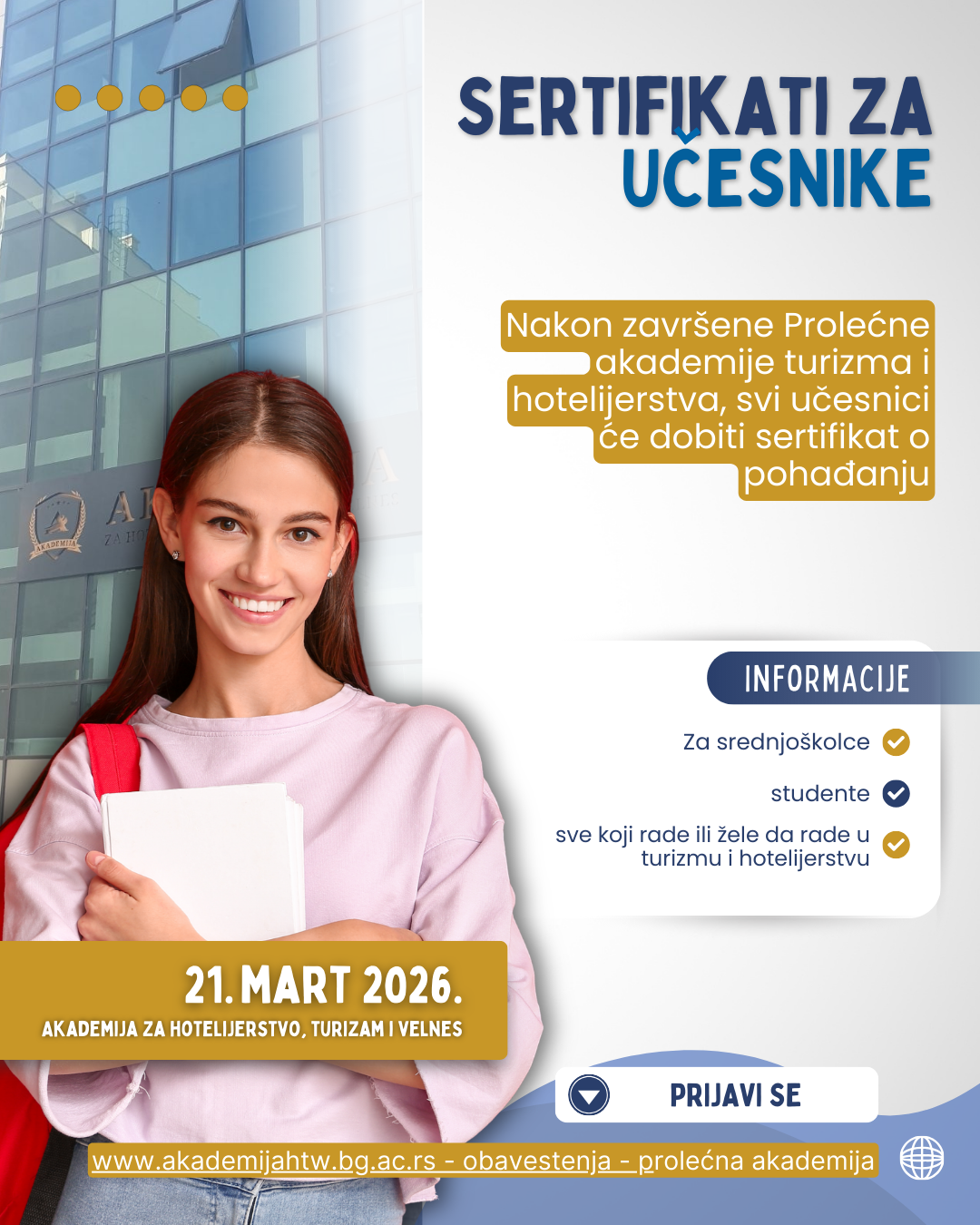 Akademija za hotelijerstvo, turizam i velnes vas poziva da se prijavite za učešće u BESPLATNOJ Prolećnoj akademiji hotelijerstva i turizma.