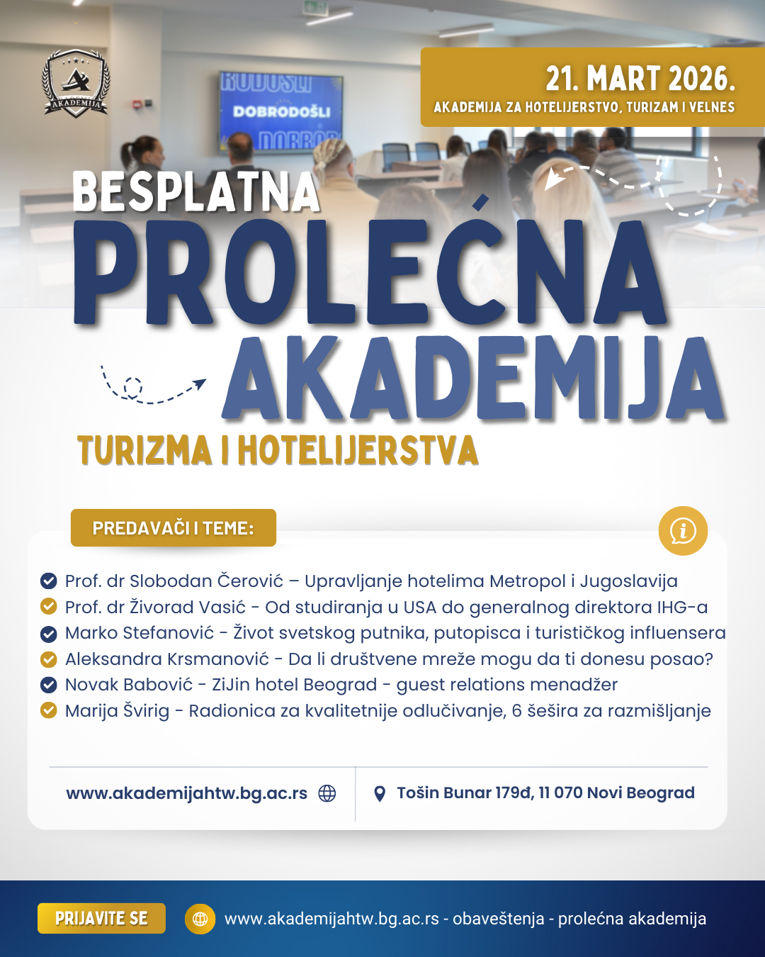 Prolećna akademija je namenjena srednjoškolcima, studentima i svima koji rade ili žele da rade u turizmu i hotelijerstvu, a žele da iz prve ruke čuju iskustva i priče istaknutih stručnjaka iz sektora.