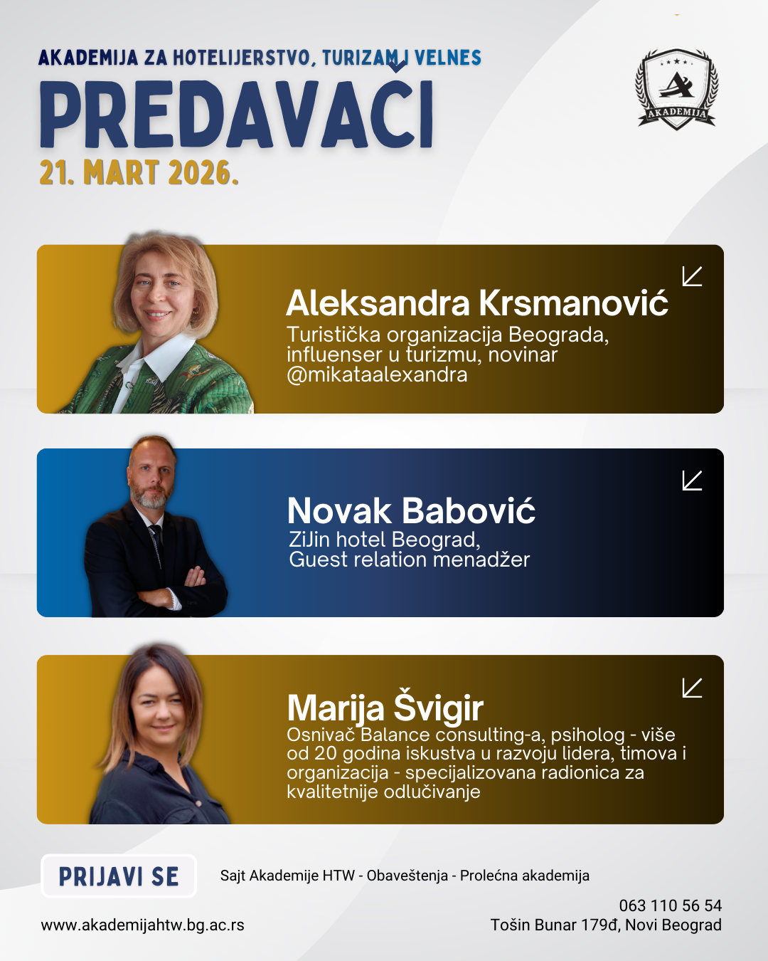Prolećna akademija je namenjena srednjoškolcima, studentima i svima koji rade ili žele da rade u turizmu i hotelijerstvu, a žele da iz prve ruke čuju iskustva i priče istaknutih stručnjaka iz sektora.