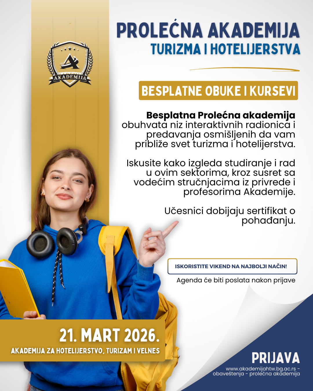 Akademija za hotelijerstvo, turizam i velnes vas poziva da se prijavite za učešće u BESPLATNOJ Prolećnoj akademiji hotelijerstva i turizma.